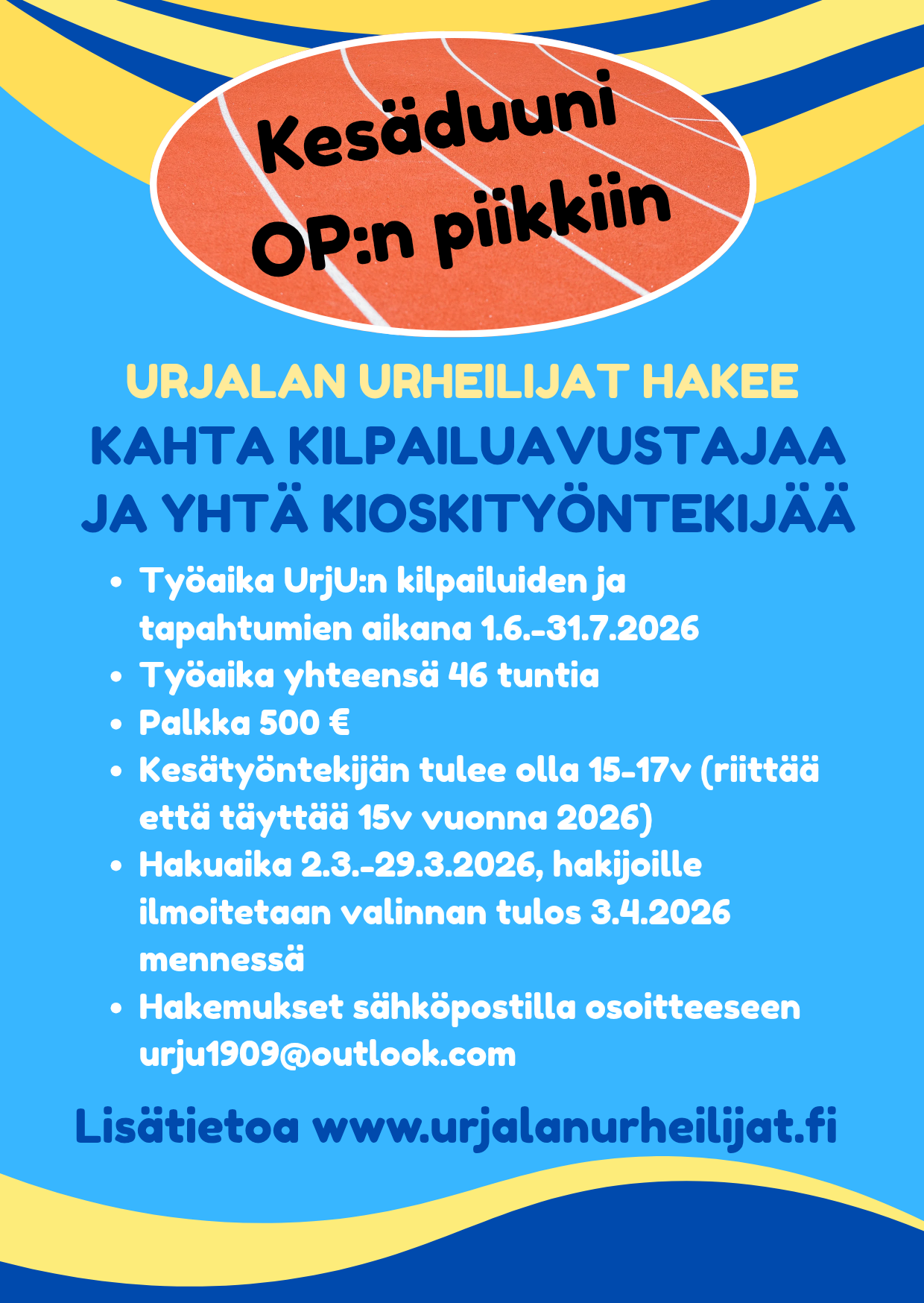 Lähetä hakemuksesi meille 29.3. mennessä osoitteeseen urju1909@outlook.com. Katso lisätietoja kesäduunisivulta!